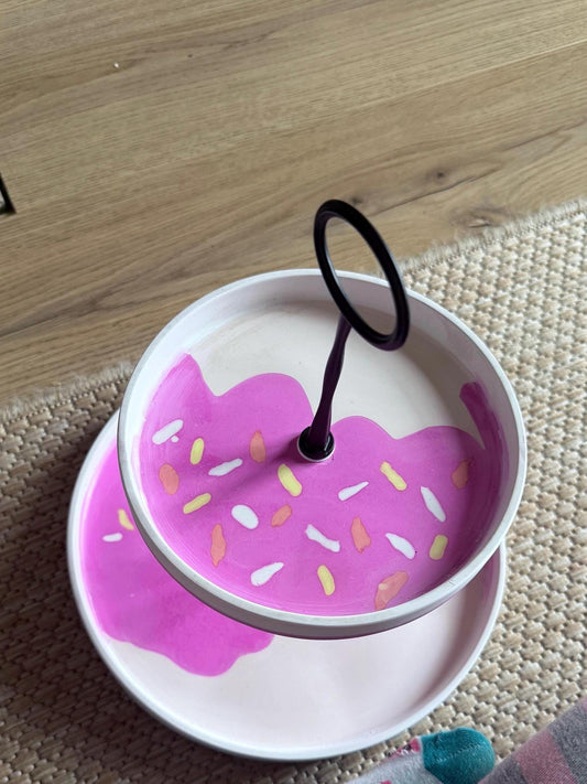 Donut Etagere – Zweistöckige Kuchenplatte mit rosa Glasur – Bunte Deko für Kindergeburtstag, Candy Bar, Süßigkeiten