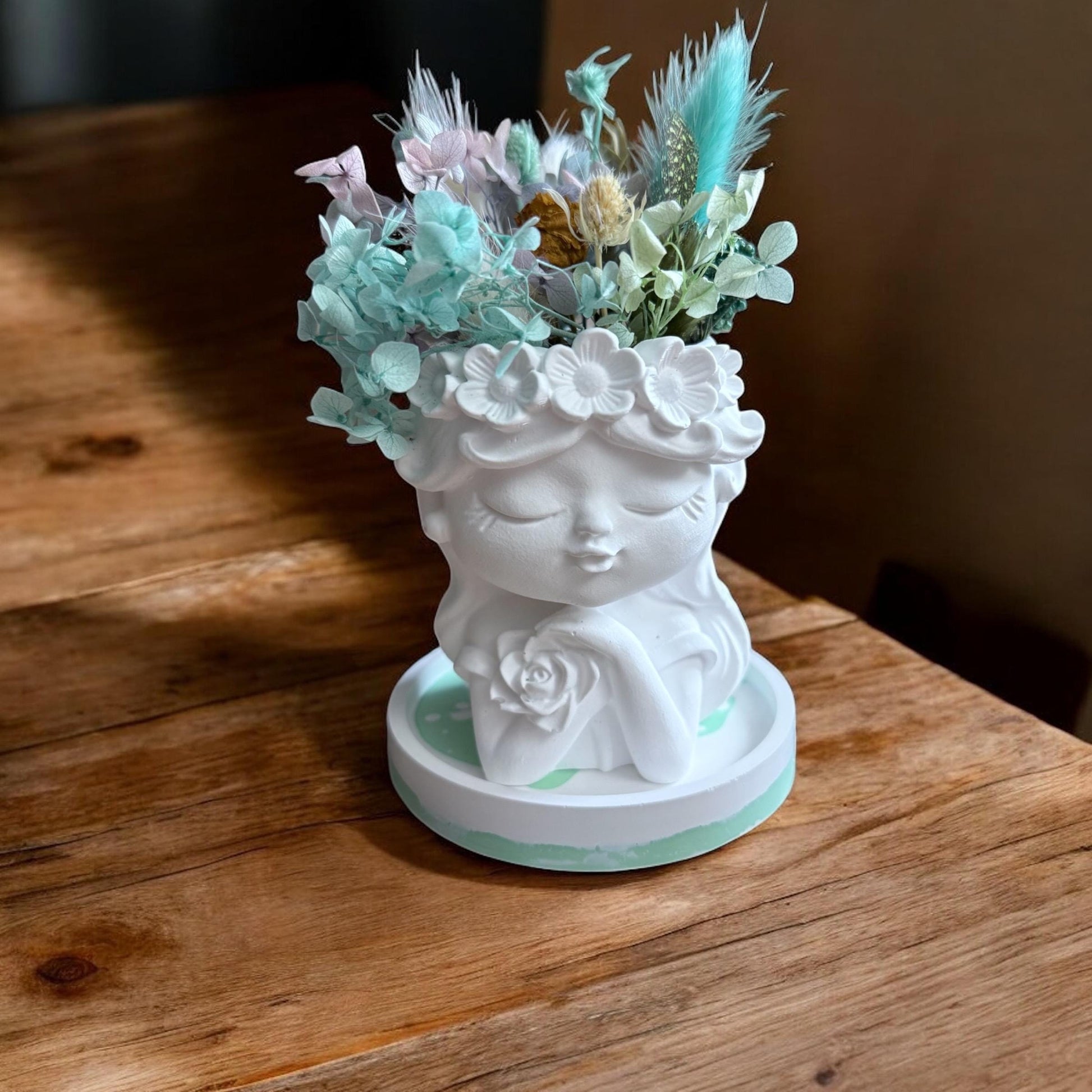 Diese einzigartigen Blumenmädchen wurden aus hochwertiger Kala Art Gießmasse handgegossen und mit einer Auswahl bunter Trockenblumen liebevoll verziert.