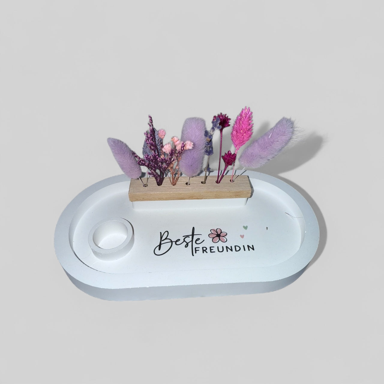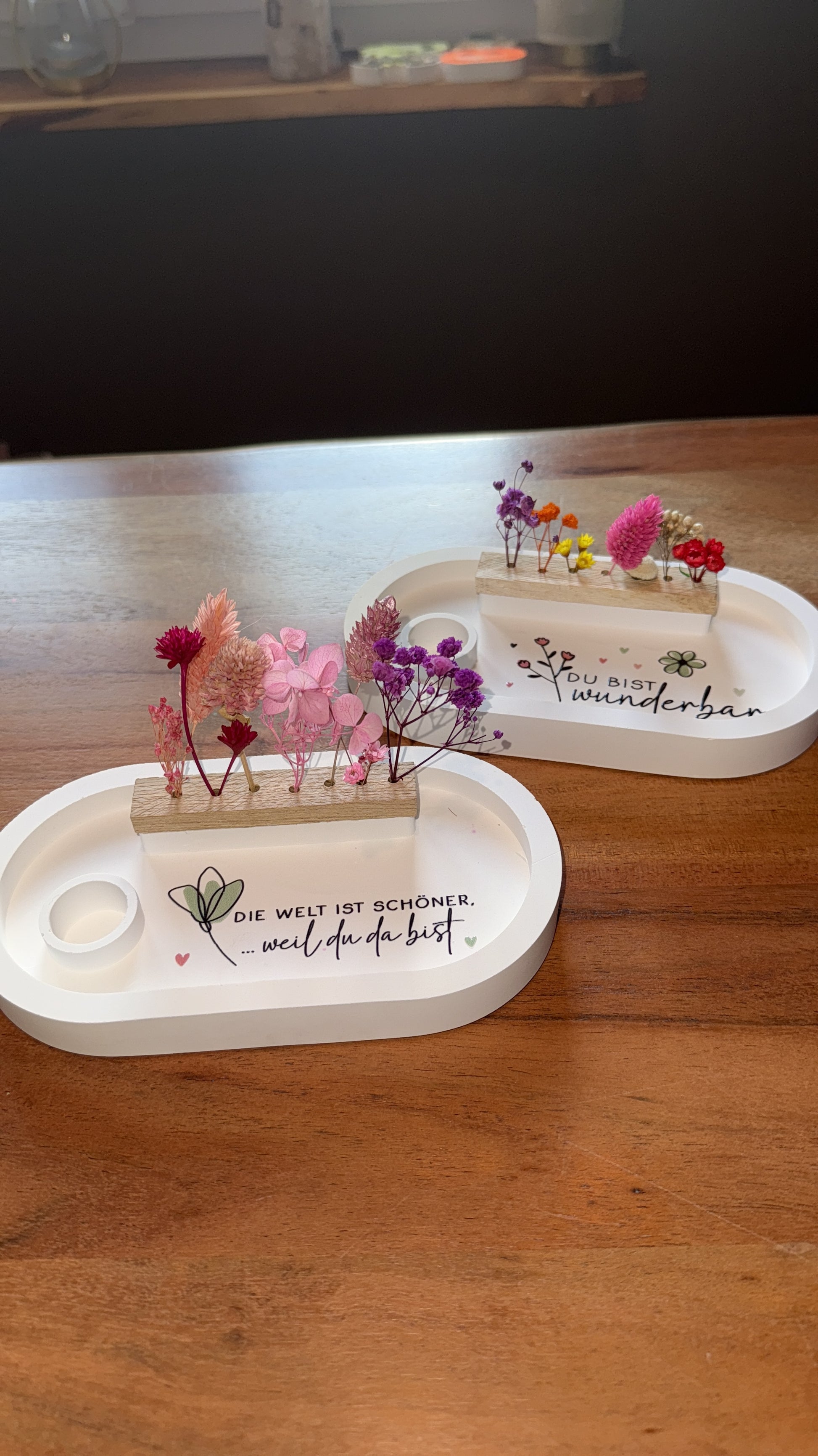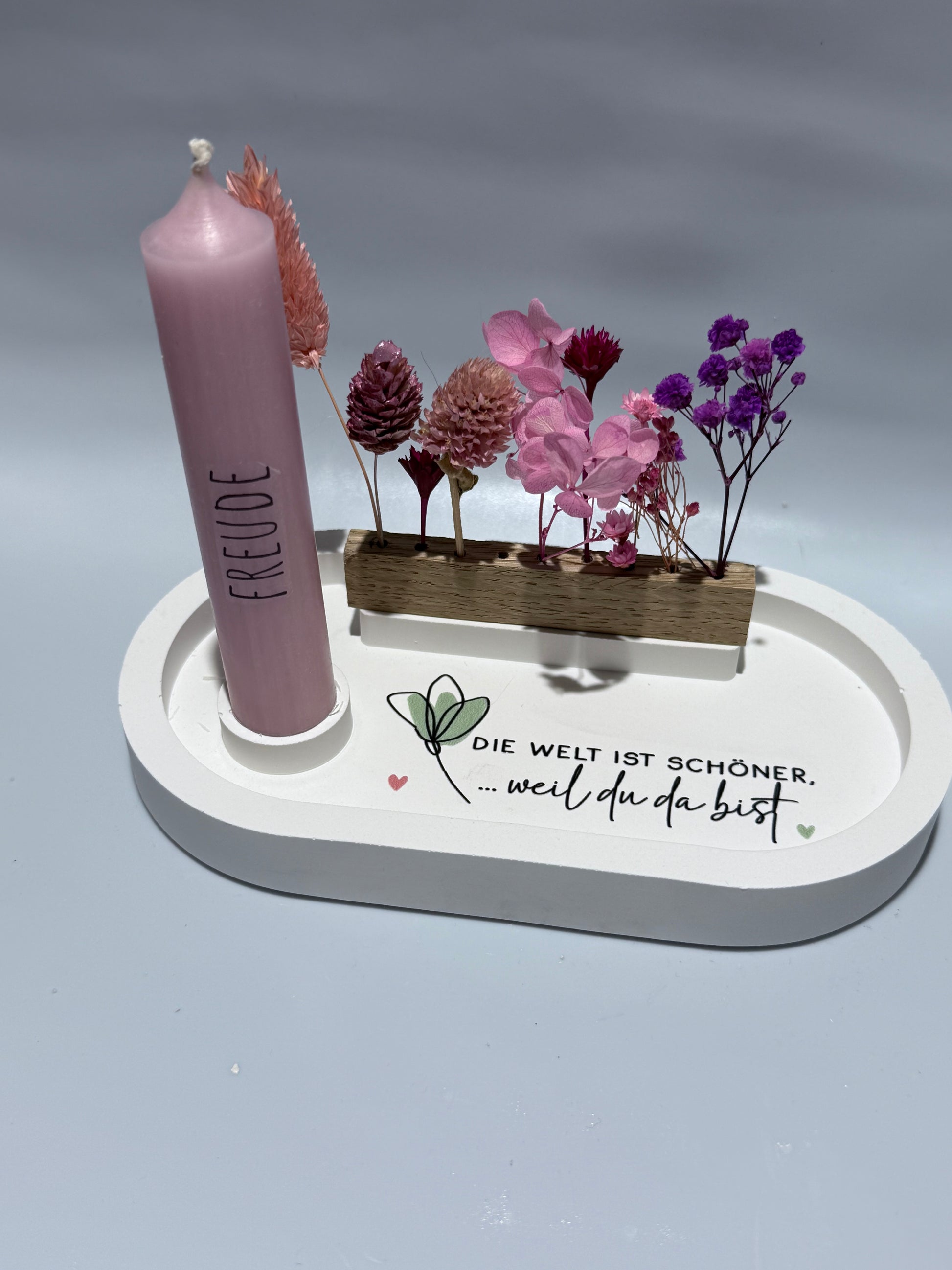 Das Set besteht aus einem Kerzenhalter mit Spruch. Trockenblumen und einer Kerze nach Wahl.
