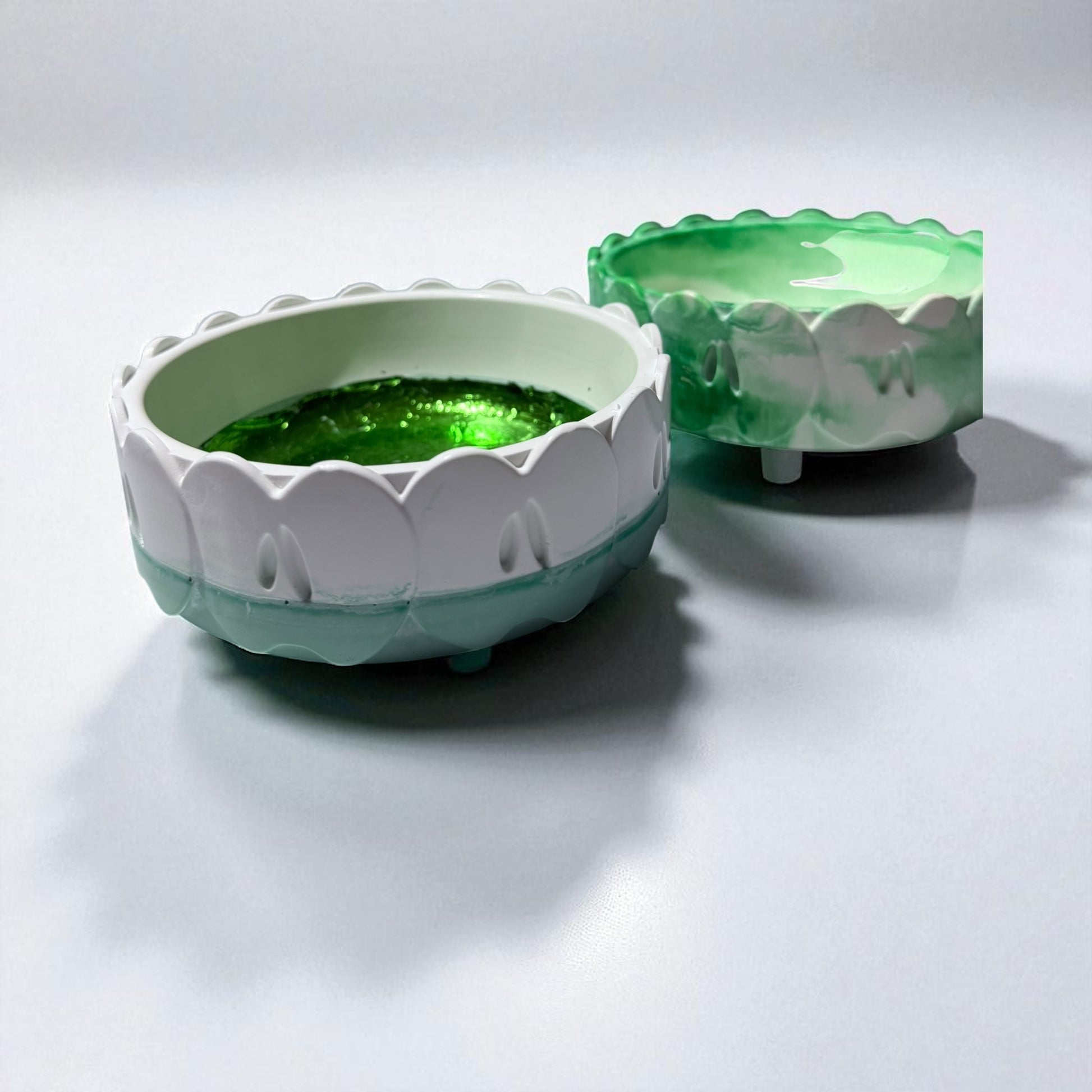 Diese dekorative Schale ist ein echter Blickfang: von Hand aus Gießmasse gefertigt, mit modernen grünen Akzenten gestaltet und zum Schutz versiegelt. Ob als Schmuckschale, für Schlüssel, Snacks oder einfach als Deko-Objekt – sie bringt frische Eleganz in dein Zuhause.